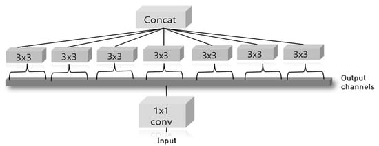 Xception is a model based on Inception. In addition to it reducing the connection between nodes using the Inception module in GoogLeNet, Xception is a network that separates finding the relationships between all the channels and finding local information [14]. Accordingly, the extreme version of the Inception module is proposed herein. As shown in Figure 3, after applying a 1 × 1 convolutional layer to the input, all the channels are separated, and each channel is individually operated for the 3 × 3 convolution. Xception uses a depth-wise separable convolution created by modifying the operation. In a depth-wise separable convolution, the convolution operation was performed for each channel, and a 1 × 1 convolutional layer was obtained. As shown in Figure 4, the standard convolution creates one feature map by considering all the channel and area information. Conversely, the depth-wise separable convolution adjusts the number of output feature maps by performing a 1 × 1 convolution operation, called point-wise convolution, after the depth-wise convolution operation that creates one feature map for each channel.