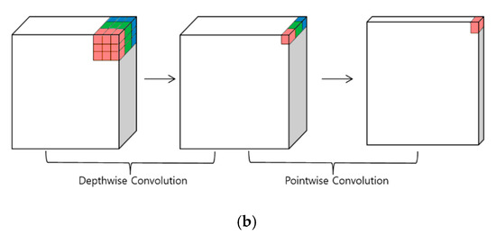 Types of convolution: (a) standard convolution and (b) depth-wise separable convolution.