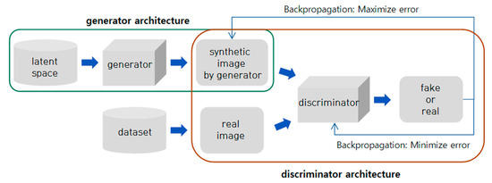 A GAN is a deep neural network architecture composed of two neural networks, namely generator and discriminator networks [15]. The generator network generates new data using existing data. The generator aims to generate new data similar to real data based on a randomly generated vector of numbers called a latent space. The discriminator distinguishes between real data and synthetic data through the generator. As shown in Figure 5, two neural networks are trained against each other by repeating the generation and discrimination processes. During the training, each of the two neural networks attempts to minimize its own objective functions. Equation (1) expresses the final objective function of the GAN.