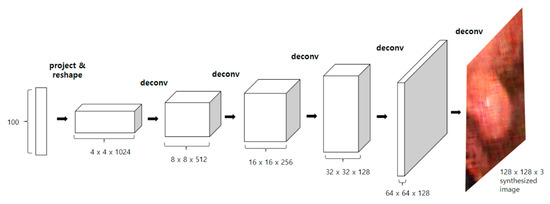 The DCGAN used in this study was an improved GAN [16]. Since a fully connected layer was used in the GAN, the generation of high-resolution images by the generator is limited, and learning is not stable. The DCGAN addresses this limitation using convolutional layers in both subneural networks. In the DCGAN, discriminators classify images as real or fake using a dense classification layer. The generator takes a random noise vector from a uniform distribution and transforms it until it produces a final image. Figure 6 shows the structure of a generator that generates a 128 × 128 image. The generator takes one tensor with the shape of (batch size, 100) and outputs one tensor with the shape of (batch size, 128 × 128 × 3).