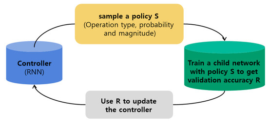 The AutoAugment method employed in this study is an algorithm that automatically finds the most appropriate augmentation policy for an image dataset through reinforcement learning. The method presented by the Google Brain team at the Conference on Computer Vision and Pattern Recognition 2019 provides an optimal augmentation method for validated datasets such as ImageNet, Street View House Number (SVHN), and CIFAR-10 [17]. The CIFAR-10 dataset contains 50,000 training images, including cats, birds, and airplanes, and Google used data consisting of 4000 images randomly selected out of the 50,000 and collectively called them the “reduced CIFAR-10 dataset”. The ImageNet dataset consists of approximately 1.4 million images in 21,841 classes including people, animals, and musical instruments, and SVHN is a dataset composed by cropping the house number image from Google Street View. As shown in Figure 7, through a recurrent neural network (RNN), which is the controller that determines the augmentation technique policy, and the child network created by the controller, various augmentation policies are applied to the dataset. In this process, we obtained R, which is the performance accuracy, and updated R in the controller to find the best policy.