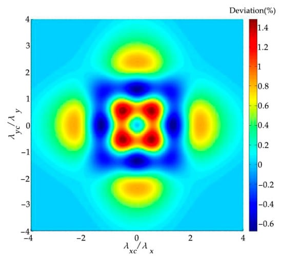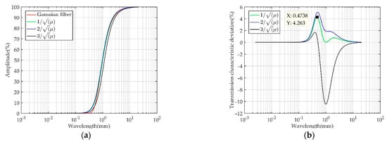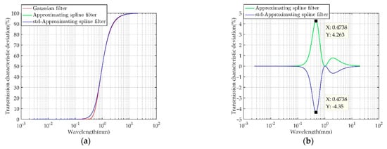 where τ denotes the approximating coefficient, and μ denotes the Lagrangian parameter, and Δx denotes the sampling interval, and λc denotes the cut-off wavelength. As shown in Figure 2a, the transmission characteristics of the approximating spline and Gaussian functions is enumerated when , , or . From Figure 2b, it can be seen that the transmission characteristics of the approximating spline filter are the closest to those of the Gaussian filter when  []. The maximum transmission characteristic deviation is 4.263%. This value is in line with the deviation range (−5.0%, 5.0%) of the simplified Gaussian filtering algorithm specified in the ISO 11562 []. Compared with the approximating spline recommended by international standard, the improved approximating spline is closer to the transmission characteristics of Gaussian filter as shown in Figure 3.