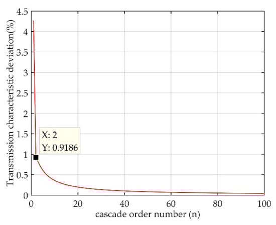 where n denotes the cascade order. The transmission characteristic deviation for different cascade orders is presented in Figure 4, where it can be seen that with the increase in the cascade order, the approximation degree also increases. However, the improvement in the approximation accuracy results in higher calculation cost. Therefore, considering the effectiveness, the cascade order should be controlled in a reasonable range. The deviation is less than 1.0% when n = 2, so it is enough to use the second-order joint approximating spline filter in practice.