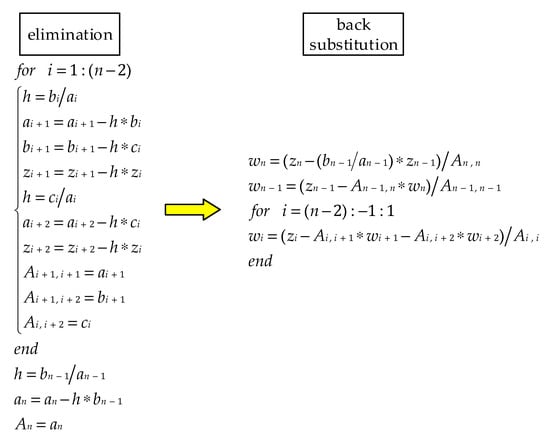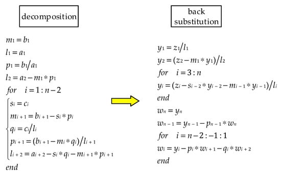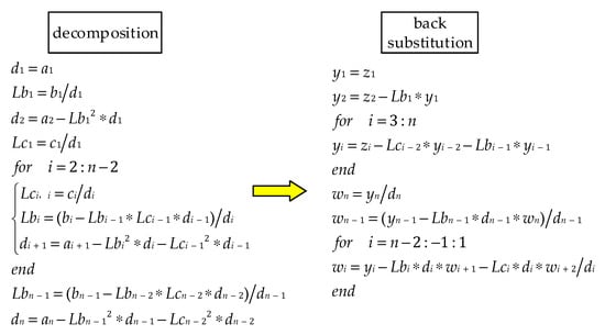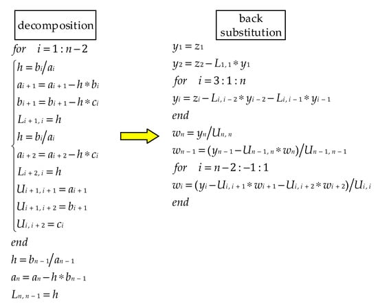 In engineering practice, Thomas method has been often used to solve ordinary differential equation, heat conduction equation, and many other equations []. These problems tend to be tridiagonal matrices, and the spline matrix is a pentadiagonal matrix. In this work, the spline matrix equations are derived by the direct triangulation of matrices. The decomposition is as follows: