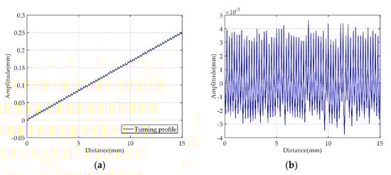 Another important factor that should be considered is the computational accuracy. In the matrix decomposition process, rounding errors accumulate. Therefore, the decomposition method of the approximate spline matrix directly affects the error of roughness parameters. As shown in Figure 10a, the turning surface was selected for the experiment. The Form Talysurf PGI® 1500S from Taylor Hobson was used to obtain the turning surface profile. The type of Form Talysurf stylus is P57340, and tip radius of the stylus is 2 μm. The sampling interval of Form Talysurf is 0.125 μm and the measuring speed is 0.25 mm/s. LS-line fitting was conducted to remove the form deviation, as shown in Figure 10b. The roughness parameter Ra and Rq were chosen for characterization and calculated according to the ISO 4288 []. The sampling length was set as 2.5 mm in this experiment, the evaluation length was 12.5 mm, and the cut-off wavelength was 2.5 mm which was numerically equivalent to the sampling length. In order to better compare the differences brought by different algorithms, four algorithms were applied to the standard cubic spline. Gaussian filter and spline filter in commercial software Mountains® were taken as the reference in this experiment. The roughness parameter Ra, Rq were obtained as shown in Table 3. It can be calculated that the errors of parameter values Ra and parameter values Rq obtained by Gaussian filter and spline filter in the evaluation software were 0.06178% and 0.06413% respectively. This was due to the difference of filtering algorithm and transmission characteristics between the two filters. As shown in Table 4, the roughness parameter value obtained by the cubic spline filter in the software was different from the results of the cubic spline filter realized by the four algorithms. In fact, the difference was caused by the implementation algorithm of spline filter. In 2011, Mathia et al. pointed out that the calculation errors of roughness parameters after using a spline filter was bigger than using a Gaussian regression filter [], which further proved the evaluation difference between the Gaussian filter and spline filter in the software Mountains®. Therefore, this study takes the output value of the Gaussian filter as the final reference. Compared with the spline filter in the software, the implementation algorithm reduces the evaluation difference between the spline filter and the Gaussian filter as shown in Table 5. The roughness value obtained by the LDLT algorithm is the closest to the Gaussian filter, and the error were only 0.002667% and 0.03484%.