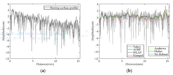 A honing surface with an obvious deformity was used in the experiments as shown in Figure 11a. The data were sampled at 4-μm interval, and 3854 data points were obtained. In order to evaluate the surface roughness accurately, the polynomial fitting method was used to remove the large shape components of the surface. The same cut-off wavelength (0.8 mm) was used in all filtering processes. The results of the robust Gaussian regression filter were used as a reference. As shown in Figure 11b, the waviness curve after using approximating spline was distorted at a large deep valley, resulting in a large distortion of the roughness. After different robust processing, the waviness profile of the filter output was smooth and natural, and the influence of abnormal features was suppressed. It can be seen that robust processing can obtain more realistic and reliable filtering values even in the case of surface profiles with large outliers, such as deep valleys or high peaks. The profile processed by the robust Gaussian regression filter was used as the reference data. A robust second-order Gaussian regression filter with a cut-off wavelength of 0.8 mm was used to perform the filtering operation. The evaluation length was set to be the same as the total length of the profile. Figure 12 shows the similarity between the waviness profile processed by different robust approximating spline filters and robust Gaussian regression filter. It can be seen that for most of the profiles, the profiles processed by the Tukey, ADRF, and Andrews are in good agreement with the reference curve, while those of the WLAV, Hampel, and Huber show significant differences.