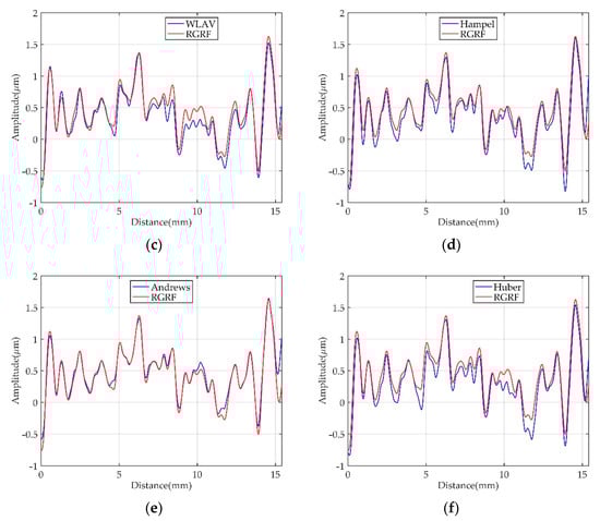 The output waviness profile of the robust Gaussian regression filter and robust approximating spline filter (a) Tukey, (b) ADRF, (c) WLAV, (d) Hampel, (e) Andrews, (f) Huber.