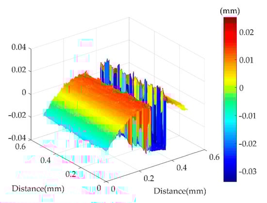 The constructed ADRF robust approximating spline filter was then applied to areal filtering. The step surface obtained by the Talysurf CCI measurement system is presented in Figure 13. The existing surface shape was deleted, and the surface details were retained. The waviness surface and rough surface obtained by the approximating spline filtering without robust treatment is presented in Figure 14. According to the output results, there was an obvious distortion in the step area, and a false peak phenomenon occurred in the vicinity of the deep valley. Therefore, the presence of steps will seriously affect the accurate evaluation of roughness.