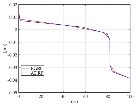 The waviness profiles of the RGRF and ADRF outputs are almost the same, and both suppress the influence of the step as shown in Figure 15a and Figure 16a. It can be seen that the robust filtering not only produced small distortion in the step region and around it but also had small deformation at the boundary. The robust processing effectively extracted the low-frequency waviness component and eliminated the influence of deep valleys features, and the obtained roughness surface was more real and reliable. The corresponding height parameter values are given in Table 8. The parameters of Sa and Sq have little difference, therefore the overall height deviation of the surface was almost the same. The error of Sv was 9%. Both of them had the same treatment effect at the maximum deep valley and could eliminate the influence of the step. The Ssk parameters were all negative, indicating that there were corresponding deep valley area, and the relative error between them was small. From Figure 17, it can be seen that the material ratio curve was almost the same, but there was a small difference between the profile peak and the profile valley. In addition, the computational time of ADRF is only 0.316 s, and the computational efficiency is much higher than that of the robust Gaussian regression filter. The experimental results show that the ADRF robust approximating spline has good performance in areal filtering with deep valleys.