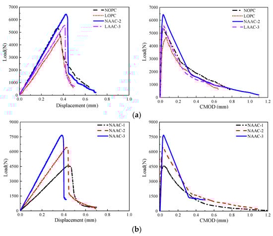 Load–displacement curves and load–CMOD curves of the tested beams: (a) different mixture; (b) NAAC; (c) LAAC.