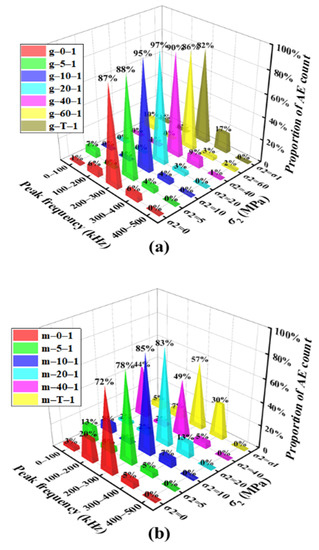 The distributions of peak frequencies of AE signals for granite, marble, and sandstone are shown in Figure 13a–c, respectively. The peak frequencies of the three types of rocks are mainly distributed in the range of 200–300 kHz, followed by 0–100 kHz, which has the tendency of increasing and then decreasing with the increase of σ2. In the range of 200–300 kHz of peak frequencies, the peak frequencies of granite, marble, and sandstone have their maximum values at confining stresses of 20, 10, and 10 MPa, respectively. The increase of σ2 leads to more cracks propagating along the direction of σ1 when confining stress is small, while the increasing σ2 will inhibit the propagations of cracks and reduce the peak frequency.