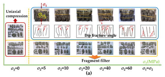 The dip fracture angle and the mass and size of rock fragments after failure under different σ2 are statistically analyzed in this part. The fragments can be divided into 5 groups according to their size: >20 mm (big pieces), 12–20 mm (small pieces), 3–12 mm (coarse grain), 1–3 mm (fine grain), and <1 mm (powder). The fragments and the dip fracture angles of the three types of rocks after failure are shown in Figure 14. The weight contents of the fragments with different size ranges are shown in Figure 15.