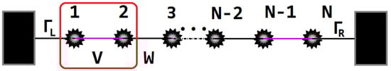Model of atomic SSH chain composed of N sites on the insulating surface (which can stand for a gate electrode). The nearest-neighbor couplings between sites are denoted by V and W and the couplings with the left and right electrodes represent symbols.