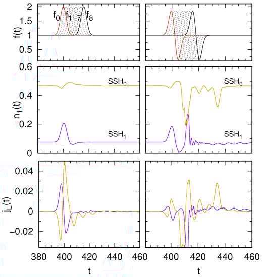 where , and is the time ordering operator. Here is the coupling part of the total Hamiltonian and represents the on-site energy part, . The physical properties of the system are expressed by the evolution operator matrix elements obtained from Equation (2). The local time-dependent charge occupancies, , can be found from the relation [48,49]: