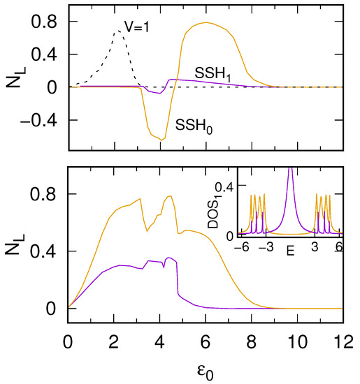 The total charge pumped through the chain is obtained by integrating the time-dependent currents, , where in our system the condition is always satisfied. Here, positive values of correspond to electrons flowing from the electrode to the chain. In Figure 3 the pumped charge from the left lead is analyzed as a function of (which corresponds to the gate voltage) for the one-Gaussian (upper panel) and two-Gaussian perturbations (bottom panel) for both SSH (yellow curves) and SSH (violet curves) chains. As one can see for symmetrical LDOS with respect to the Fermi energy () the charge does not flow through the chain, independently on the perturbation shape and topological phase of the chain. For the shape of the train impulse spreading through the chain plays a crucial role in the electron pumping effect in topological systems. For the one-Gaussian perturbation the couplings between sites locally increase leading to smaller difference between parameters. In this case, the energy gap is not closed. It is the reason that electrons do not flow through the SSH chain for smaller than the energy gap width (here the gap appears for , cf. the inset in Figure 3, bottom panel). Note that also for the chain in the nontrivial phase the pumping effect does not occur for these values of although there is a topological state at the first chain site (nonzero LDOS at the Fermi level, see the inset, violet curve). In this case, electrons which flow out from the electrode cannot be transferred through the middle part of the chain due to the energy gap at these middle sites. It means that the zero-energy edge states do not play a main role in the electron pumping through 1D systems—this problem will be discussed in more details in the next section.