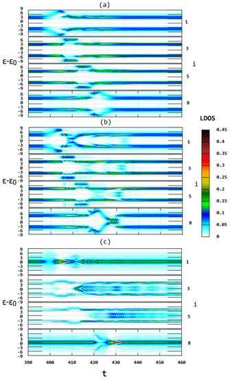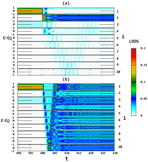 where the occupancies can be expressed similarly to Equation (3) by the corresponding evolution operator matrix elements. In this case, the spectral density function at each chain site for the zero temperature satisfies the relation: