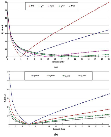 The pass_band practical criteria presented in [16] is applied in determining if the filter in resonance mode or high impedance not. This pass_band practical criterion studied the effect of the single tuned filter parameters such as filter size (QC), quality factor (Qf), and tuned frequency (tf) on the filter performance. The analysis showed that the Qf has a less significant effect than the QC and tf on the impedance–frequency characteristics curve. Increasing tf or QC makes the curve be flatter as shown in Figure 5. So the pass_band is defined as the band which contains the frequencies at which the filter impedance is very low compared with the system minimum impedance load “if the filter impedance is lower than 1/10 of the system minimum impedance load” [16]. This declares the concept shown in Figure 5 that the filter passband increases with increasing the filter capacitive reactive power and increasing the order of tuned frequency. For example, the 7th order harmonic filter has more flatten impedance characteristics curve rather than that of the 5th order filter, as shown in Figure 5a.
