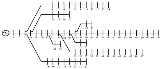 The proposed method is applied to the modified IEEE 69-bus distribution system [9]. The total active and reactive loads of the original system are 3.802 MW and 2.694 MVAR, respectively. Six nonlinear loads are added and located at buses (12, 26, 27, 28, 43, 49, 53, and 63) in the system shown in Figure 7. Four DG units are also considered to be installed at buses (28, 44, 47, and 53) each one has a capacity equals to (190.1 + j 134.7) kVA.
