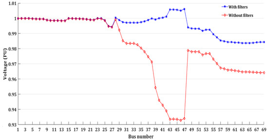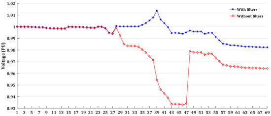 Fundamental voltage profile of the 69-bus system with and without filters in case 1.
