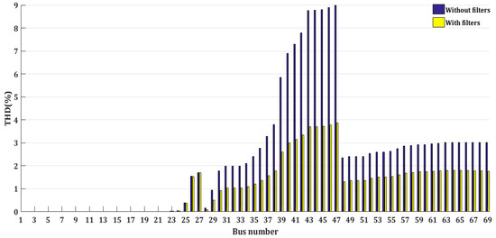 Total harmonic distortion (THD) of the 69-bus system buses with and without filters in case 1.
