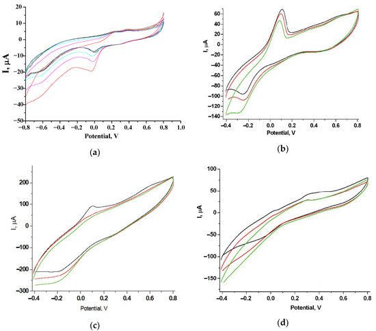 Cyclic voltammograms (CV) of the graphite electrodes modified with Cu/CeS (a), Fe/Ce (b), Au/Cu (c), and Ag/Ce (d). CV profiles as outputs on addition of H2O2 in concentration: (a)—0 mM (blue), 0.2 mM (cyan), 0.5 mM (pink), 1 mM (red); (b–d)—0 mM (black), 1 mM (red), 3 mM (green). Conditions: scan rate 50 mV·s−1; Ag/AgCl (reference electrode) in 50 mM NaOAc buffer, pH 4.5. The surfaces of the graphite electrode (GE) were modified with 1 µg (a) or 5 µg NZs (b–d) and covered with Nafion.