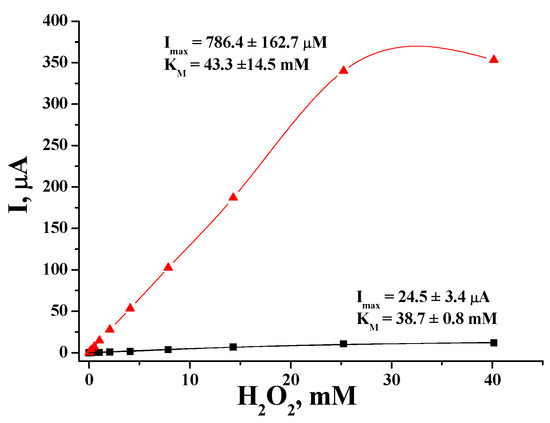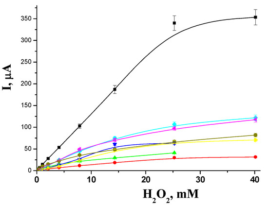 PO is widely used in different fields of science and industry, especially in analytics for H2O2 determination [1]. Many natural enzymes (oxidases) produce H2O2 as a byproduct of their enzymatic reactions, so that detection of the target substrates can be performed by measuring the generation of H2O2. This principle is widely used in oxidase/peroxidase-based biosensors [4,5]. To determine H2O2, PO-catalyzed decomposition of H2O2 may be detected with optical biosensors (in the presence of chromogenic substrates) or with amperometric biosensors. The wide practical application of natural PO is still limited, however, due to the high cost of the enzyme and fast enzyme inactivation in the presence of H2O2.