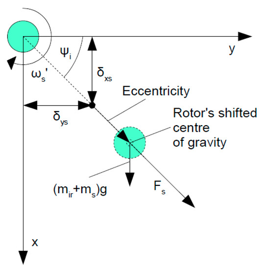 One of the factors affecting the dynamic response of the ball bearing is the eccentricity of the rotor, on which the bearing is seated [49,50]. In rotor-based systems, it is impossible to avoid the shaft’s eccentricity due to its improper manufacturing (mass distribution) or improper coupling with the propelling motor. In the real conditions, the acceptable eccentricity level is equal to (1–6) μm and affects the variable contact in the ball bearing. In Figure 2, the effect of eccentricity acting on the rotor system is presented. The gravitational acceleration (mir + ms)g additionally intensifies the effect of the eccentricity on the system’s dynamics. Centrifugal force Fs of the rotor-bearing system refers to the shifted center of gravity by eccentricity, gravitational acceleration, and deformations in the x–y plane.