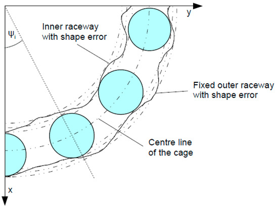 In the derived mathematical model, the elastic contact deformation δi is calculated for each i-th rolling element corresponding to its angular position ψi. In the derived equation (Equation (6)), the effect of radial internal clearance and waviness on rolling surfaces are taken into account:
