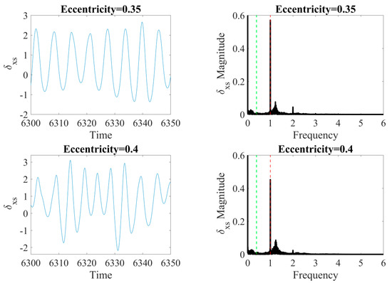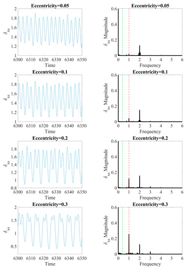 The time series of deformation in the x-axis (left) and FFT spectra (right) by the different values of the rotor’s eccentricity. In FTT, the red-dashed line corresponds frequency of the shaft’s velocity and the green-dashed line denotes the cage’s characteristic angular frequency.
