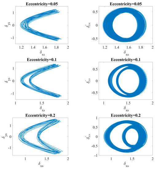 For better clarity, for the same values of rotor’s eccentricity, the orbit plots and corresponding δxs-phase plots (Figure 5) are presented to identify and describe the dynamical behavior of the system. As the force is subjected to the x-axis, significant changes are expected in only that direction. Obtained orbit plots for the eccentricity ecc = {0.05; 0.1; 0.2; 0.3} are closed denoting the periodic motion of the bearing. Visible widening of the orbits is presumably related to the additional waviness of the raceway surface.