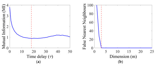 The mutual information (MI) (a) denotes the time delay (τ) of the phase-space trajectory by the first minimum (red-dashed line). The first minimum of the False Nearest Neighbors (FNN) (b) denotes the dimension (m) in the phase space.