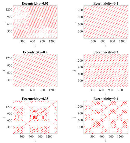 As the eccentricity introduces additional excitation into the system nonlinearities, such as contact loss in multi-body interactions present in the system play a more important role. Consequently, we expect the appearance of evolution and bifurcations of periodic solutions with the change of the eccentricity. Finally, various instabilities [30] occur in the system. In the specific conditions, chaotic motion [31] can develop, those effects can be studied by different methods [32], such as the Maximal Lyapunov Exponents, Test 0–1 [33] or Multi-Scale Entropy [34]. One of the promising methods to analyze the chaotic response of ball bearings is the recurrence analysis [35,36]. According to Henri Poincaré’s work, the dynamic system comes back to the initial state or its close neighborhood in the phase space after some characteristic time forming so-called Poincaré sections [37]. Eckmann et al. [38] proposed the tool for visualization of the small parts of time series in the form of a recurrence plot (RP), however, to obtain the quantitative information on the considered state, the Recurrence Quantification Analysis has to be conducted [39]. The mentioned method has been already applied to characterize nonlinear dynamics in the variable dynamics of the mechanical systems [40,41,42,43,44] and manufacturing processes [45,46]. The advantage of the recurrence analysis is that it detects the natural behavior of mechanical systems, i.e., occurrence of the same state after some time. That is why, with help of recurrences, it is possible to recognize defects, rapidly changing vibrations as chatters in milling, or varying misalignments or clearance in time. Ball bearings and other rotational systems generate rapidly changing vibrations in time and minor quantitative or qualitative changes in the dynamical response can be studied in short-time intervals. In this paper, it is used for the analysis of ball bearing’s nonlinear dynamics.