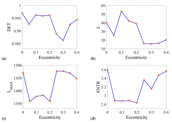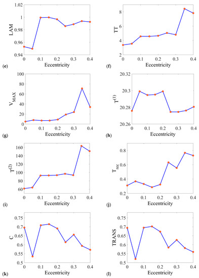 By observation of the recurrence plots (Figure 7), it is possible to distinguish periodic and chaotic motion of the ball bearing for specific eccentricity. For small values of the eccentricity, the periodic character of response is observed, confirming the course of the deformation time series (Figure 5a–c). For the eccentricity ecc = 0.3, the periodic character of the response is vanishing, it is evidenced by broken diagonal lines, observance of additional very-short diagonal lines in the perpendicular direction, and single isolated points. The last two cases have a strongly non-regular character with numerous empty zones (indicating losses of correlations) and black regions informing about responses trapped to characteristic states in the corresponding phase space. In those cases, the distances between lines are modulated in unexpected ways informing about multiple unstable orbits that form the chaotic attractor. The square-like structures confirm the presence of intermittences are observed [79,80]. For the last three cases, the stronger influence of vertical structures is visible in contrast to the periodic solutions.