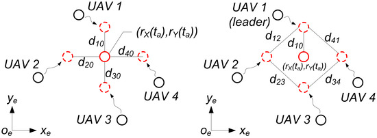 We define a diagonal matrix , which indicates the knowledge of reference formation trajectory (RFT) of each agent. If , agent i can obtain the RFT (by sensing/detecting), i.e., a leader. Otherwise, if , agent i is a follower, for . Then, the leader set is defined as . The leader set is a subset of , which contains the indices of the leaders. Particularly, all the quadrotors are leaders, when . The indices of the followers are contained in the complementary set of , namely, .