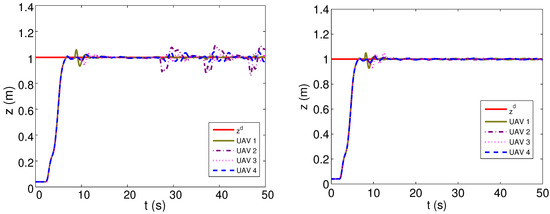 Altitudes of the quadrotors. Left: Formation control without high-order feedforwards. Right: Our proposed formation control.