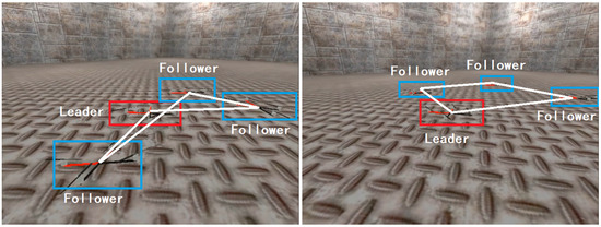 Figure 8 shows the animation in the simulator. On the left of Figure 8, the formation control without high-order feedforwards is used, where the quadrotors fail to preserve the rectangle formation pattern after several second of flight. On the contrary, the nonlinear-flatness-based formation control can preserve the rectangle formation and track the RFT that is only given to the leader.