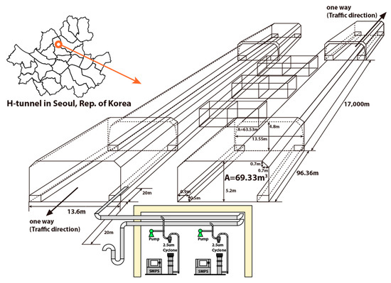 The measurement of particle number concentration by using SMPS was carried out in the H tunnel (37°60′ N, 126°97′ E) located in Seoul, Republic of Korea. The tunnel is the second longest tunnel in Seoul, and is located on the internal-ring road. As presented in Figure 1, the H tunnel consists of the two one-way tunnels wherein the length of entire tunnel embraces approximately 96 m of approaching path and 17,000 m of the length of main tunnel; the width of tunnel is 13.6 m while the height thereof is 5.2 m at the approaching path. In the present study, the two pipe inlets are installed. The inlets, respectively started from the two reference points of common distance of each 20 m from the inside and outside of the tunnel exit, were penetrated into the measurement station with the flow rate of 18 m/sec. Thereafter, the exhausts, discharged from vehicles, were isokinetically sampled through the pipe inlet of the diameter of 1/4 inch.
