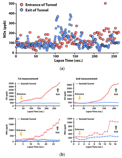 Figure 2a presents the results of measurement of CO (48iQ Thermofisher Scientific Inc., Waltham, MA, USA) and sum of NO and NO2 (NOx) (42iQ Thermofisher Scientific Inc., Waltham, MA, USA) at 2.3 m from the tunnel entrance and the 20 m from the tunnel exit as the sampling point at same time. In addition, Figure 2b shows the moving vehicle, loaded with instruments capable of measuring CO and NOx was traveled to collect corresponding measurements inside of the tunnel, and the measurements were compared with those collected from outside of the tunnel. As a result, both measurements collected by moving vehicle and collected at the measuring station corresponded to each other within the uncertainty of 8%. This indicates that the concentration from the external point 20 m distant from the tunnel can be verified as an indicator of the tunnel entrance.