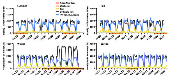 The vehicles passing through the tunnel were classified into (1) ordinary cars, (2) taxi, and (3) bus/recreational vehicle (RV)/trucks, wherefrom the ordinary cars, taxi, and the bus, recreational vehicle (RV), and trucks were regarded as representing gasoline, liquefied petroleum gas (LPG), and diesel fuel, as a fuel of respective engines. The traffic volume in terms of each type of vehicles manifested no significant seasonal differences to each other, whereas it manifested hourly variations in a day, and variations in weekdays. With regard to the variation of traffic volume in weekdays, the traffic volume of ordinary cars on Sunday appeared similar to weekdays as illustrated in Figure 3, however the traffic volume of buses/RVs/trucks decreased by approximately over 25% compared (compared) to those of weekdays. In the case of the period of “Asian New Year (the Lunar Year),” the distinct variation in traffic volume appeared; the traffic volume of ordinary cars increased by approximately twice as much, whereas that of buses/RVs/trucks decreased by approximately 25%. Thus the varying particle number concentration was attributed to the differences in varied traffic volumes of ordinary cars and buses/RVs/trucks.