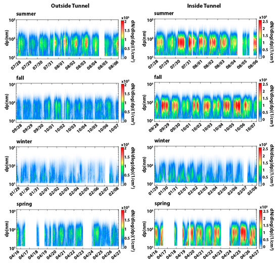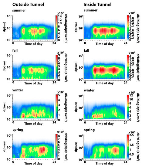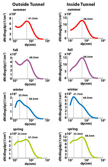 The particle size distributions of each season, obtained during the period of the present study, are presented in Figure 5. The mode of the particle number concentration in the inside and outside of the tunnel appeared in the range 61.5~68.5 nm in summer, fall, and spring, whereas it appeared with smaller value in winter distributing in the range 21.7~25.9 nm. This was attributed to the temperature and humidity in the atmosphere affecting the final condensation diameter. It was announced in results of the previously conducted studies that the growth of particulate matters is significantly associated with (1) temperature, (2) humidity, and (3) reaction time [32,33,34,35]. To analyze the daily variation in the diurnal pattern of the particle number concentration, the hourly average values thereof in a day were calculated and are presented in Figure 6. The values increased from 4 to 6 AM and remained constant until 9 PM. Thereafter, the values decreased. The number and speed of vehicles per hour were compared with the corresponding particle number concentration. The traffic volume of vehicles passing through the tunnel increased from 5 to 7 AM and then the traffic volume was kept constant to 0 AM; the variation corresponds to the variation in the particle number concentration observed each hour. The major cause of variation in the particle number concentration was attributed to the discharge of exhausts from vehicles passing through the tunnel.