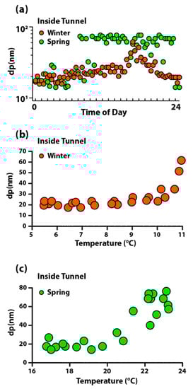 Figure S2 represents the pattern of diurnal variation of the mode of number concentration of inside and outside of the tunnel employed for the analysis of effects of temperature on the final condensation diameter. The inside of the tunnel exhibited relatively constant mode of particle diameters (68.5 nm). The outside of the tunnel manifested the mode of particle diameter of 14 nm in the interval from 11 PM to 6 AM, while the mode of 68 nm appeared in the interval from 6 AM to 11 PM. Figure 7a represents the diurnal pattern of the variation of the mode of particle diameter in the inside of the tunnel in winter and spring. Figure 7b,c represents the correlation of the mode of particle diameter with temperature in winter and spring. The mode of particle diameter according to temperatures in respective seasons exhibited high correlation together with rapid changes thereof at temperature above the breakthrough point. Further, the mode of particle diameter increased rapidly to 62 nm at the level of temperature 10~11 °C, contrary to the slight increase from 20 nm to 28 nm at the level of temperature from 5 °C to 10 °C inside of the tunnel in winter. For the case of spring time, the mode of particle diameter of 10~30 nm appeared at higher level of temperature of 17~21 °C [32].