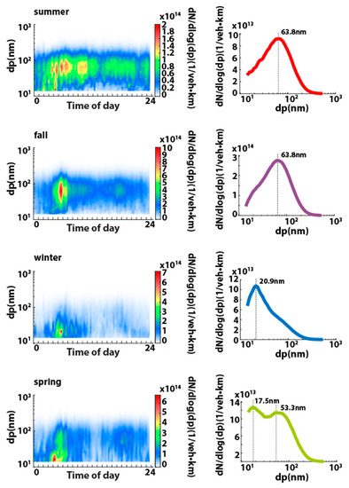 According to the previously conducted study, the condensation of particles reported that the growth of particle diameter would be limited by the formation of competitive relationship with moisture in the atmosphere [32,33,34,35]. In the present study, the temperature acted as a major cause of determination of final condensation diameter after emission, which is also dependent on diverse environmental effects comprising particle number concentration including humidity. The particles in the discharged exhausts in spring time, wherein the temperature are relatively higher than winter time, were estimated to be involved in the competitive reaction with potential moisture to reach the final condensation diameter after emission.