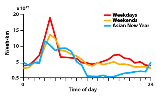 Diurnal patterns of vehicle emission rate for weekdays, weekends, and in period of Asian New Year.
