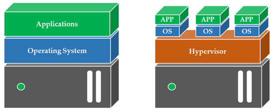 Servers (physical machines: PMs) have higher specifications than personal computers, with the purpose of providing computing power for large volumes of data, and server virtualization technology is applied to efficiently utilize these resources. Server virtualization refers to logically dividing a PM into several virtual machines (VMs). As shown in Figure 1, virtualization runs the application by dividing the main OS into several smaller OSs through a hypervisor, which is a virtualization platform, unlike the traditional architecture of one OS for each server. The hypervisor allocates PM resources, such as central processing unit (CPU), memory, and network, to individual OSs. One unit of such an OS is called the VM. Most of the recently developed PMs for DCs are managed in virtualization environments.