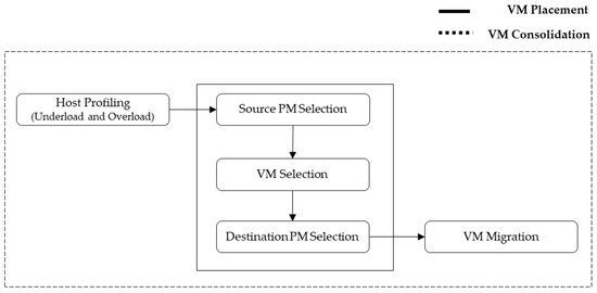 The VM consolidation framework uses a separate monitoring tool, as shown in Figure 3, where the PM is monitored to minimize the number of active PMs using the idle switch in the event of an overload or underload. VM placement is then implemented if certain conditions are met. The key element of VM consolidation is VM placement, which consists of the source PM selection to determine which PM is placed in the power-saving mode, VM selection to determine which VM to migrate from the source PM, and destination PM selection to determine which PM is assigned the selected VM. It detects PM overload or underload; the detected PM then selects the VM to migrate from the VMs assigned to the source PM, and VM placement is implemented to decide the PM to migrate to.