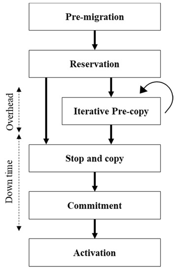 The virtualized environment provides live migration, which supports non-disrupted service by the VM during migration to another PM. However, live migration decreases the performance owing to overload during the process of memory copying and causes a short downtime even though the application service does not stop, which is why frequent VM migrations should be avoided. VM migration is divided into precopy and postcopy at the point of VM interruption. Precopy is the commonly used technique, and its process is shown in Figure 4 [10].