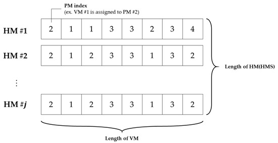 For VM placement, HM contains the PM–VM mapping information, which is the VM assignment to PM information. One HM is in a permutation form, where each array represents the VM index, and each index value represents the PM index to which the VM is assigned. This solution representation is schematically shown in Figure 5.