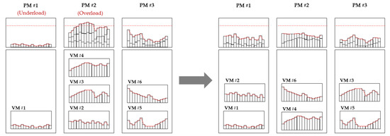 For HS, the most influential operator that creates a significant neighboring solution is the PA. The HMC is the standard for neighborhood search, and randomization contributes to avoiding the local solution. Their suitable combination plays an important role in creating an improved solution. The PA is designed to demonstrate high performance and search for an efficient solution for the VM consolidation model. In VM consolidation, VM migration occurs when either overload or underload of the PM workload is detected. The contrapositive of the proposition mentioned above becomes “if overload or underload of the PM workload does not occur, then VM migration is not necessary”. Ultimately, if the PM workload remains constant, the VM need not migrate. As shown in Figure 6, if a VM with the inverse workload is combined, the PM workload remains constant, and the VM can achieve sustainable operation by minimizing DC power consumption and VM migration, which is the objective of VM consolidation. The measure indicating the degree of stability of the PM workload is calculated as the standard deviation of the workload time-series data. The closer the standard deviation is to 0, the more stable is the workload.