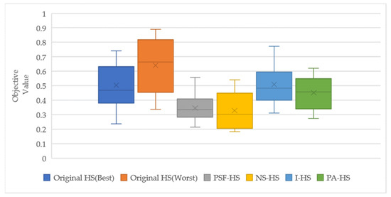 The results of the original and adaptive HS were then compared. For the adaptive HS, the worst and best values of the original HS were set as the upper/lower limits of the dynamically changing parameter from start to end of the experiment. The experimental results in Figure 7 and Table 4 show that each average value of the adaptive HS result was better than the worst result of the original HS, and the best result was the average value of the NS-HS. Based on the average values, the adaptive HS algorithms showing better results than the original were NS-HS and PSF-HS.