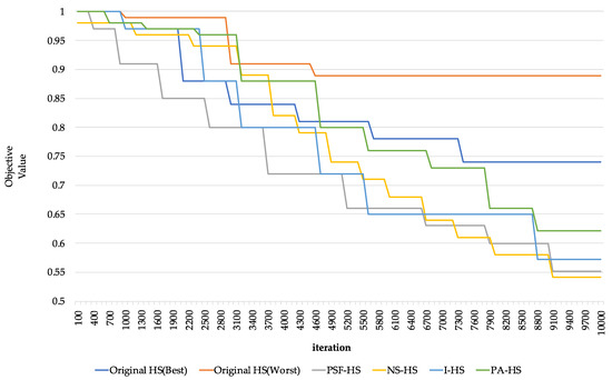 Based on the best results, all the adaptive HS algorithms showed better results than the original HS. Figure 8 shows the graph of the solution search process for each algorithm based on the worst result. From the point of view of hill climbing, which aims to create significant neighborhood solutions to obtain the global optimum, an algorithm can be evaluated with good quality using the numbers of the solution improvement frequencies. Adaptive HS seeks diversity through a wide solution search area at the beginning and reduces the search area to obtain the optimal solution. Experimental result show that the solution improved at the beginning of the algorithm, but the solution did not improve towards the end for the original HS. However, the adaptive HS showed that the solution improved even towards the end. Accordingly, the adaptive HS is an efficient algorithm to determine the optimal solution in terms of exploration and results.